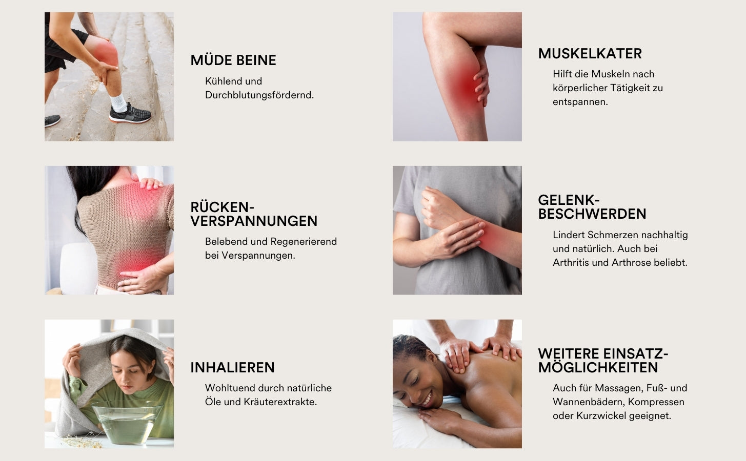 Erlebe die grenzenlose Vielseitigkeit mit unserem veganen Herbal Cooling Balm! Von müden Beinen bis zu Rückenverspannungen, Muskelkater bis zu Gelenkbeschwerden - er ist die universelle Lösung. Aber damit nicht genug! Löse ihn im Bad auf und genieße eine erfrischende Inhalation oder verwandle ihn in Wadenbänder für unterwegs. Perfekt für Massagen und mehr - ein Produkt, unzählige Anwendungen!
