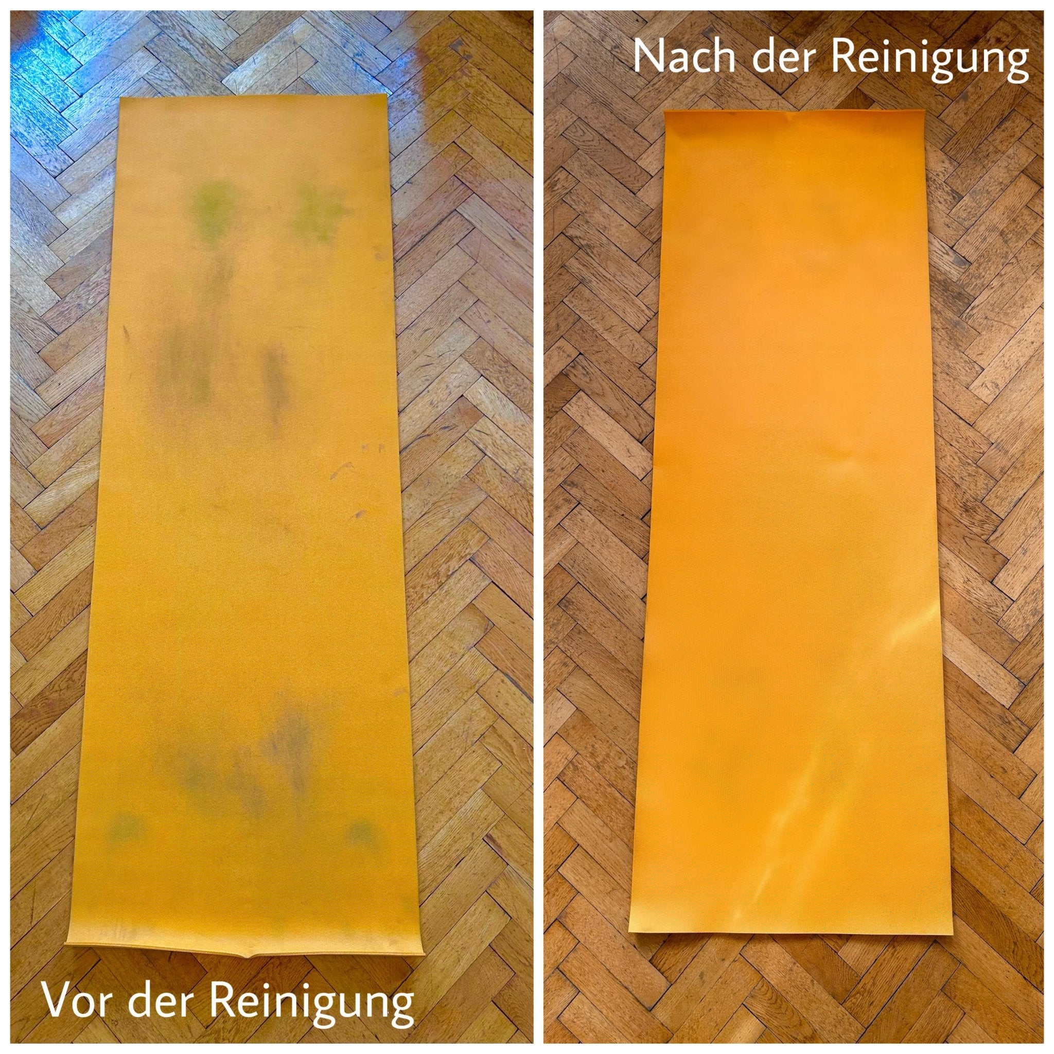 Unser Tiefenreiniger ist ein echter Allrounder für deine Yogamatte. Er spült Hautfette, Öle und Schmutz aus den Poren, was nicht nur die Matte reinigt, sondern auch ihre Griffigkeit wiederherstellt. Die Griffigkeit einer Matte entsteht durch die Fähigkeit ihrer Poren, Schweiß aufzunehmen. Wenn diese jedoch durch genannte Stoffe verstopft sind, wird die Matte rutschig. Bevor du deine Yogamatte reinigst, prüfe bitte, ob sie laufendes Wasser verträgt. Einige Matten könnten durch Wasser beschädigt werden. Schau daher zuerst in den Herstellerhinweisen nach. Wenn der Hersteller deiner Matte von einer Reinigung mit laufendem Wasser abrät, empfehlen wir dir von der Tiefenreinigung ab zu sehen.
